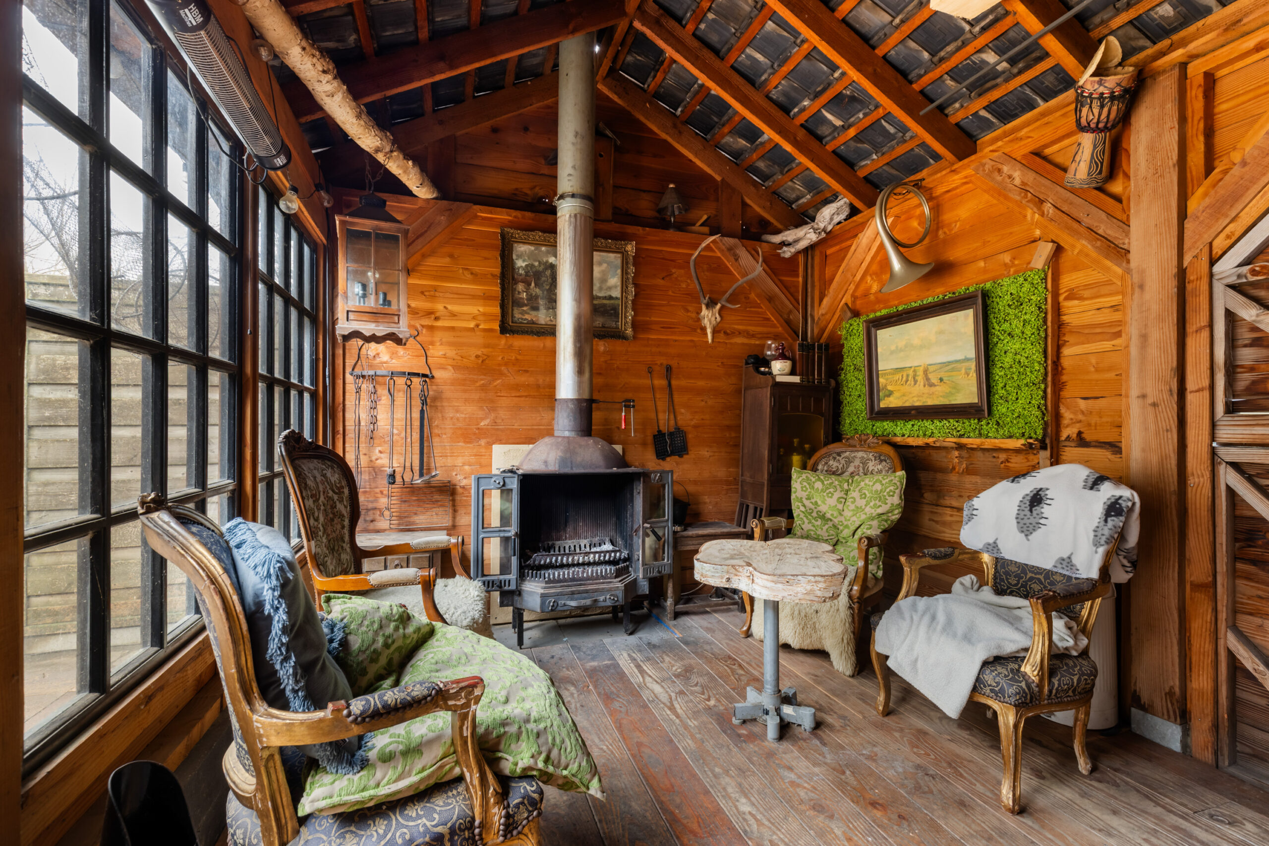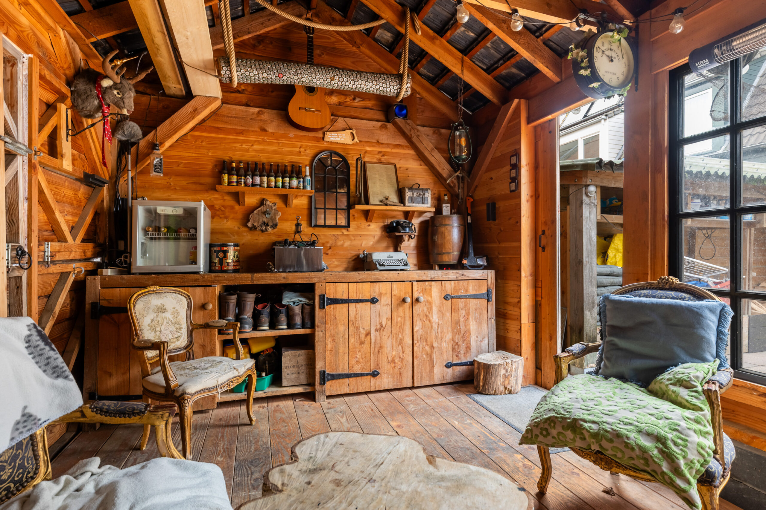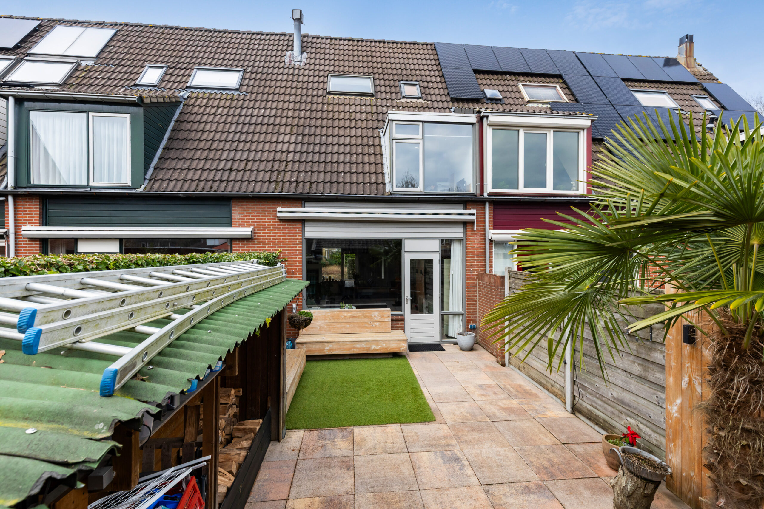 De achtertuin is gesitueerd op het zuidoosten en is voorzien van siertegels met een gedeelte kunstgras wat op de tegels ligt. Aangrenzend bevindt zich een houten haardhok met open bergruimte en een sfeervolle overkapping of tuinkamer met schuifdeur vanuit de tuin en openslaande deuren naar het achtergelegen parkeerplein. Een heerlijke ruimte met een houtkachel om tot laat in de avond te genieten van het buitenleven het hele seizoen door. Door de vrije ligging aan de achterzijde ervaart u eveneens optimale privacy!